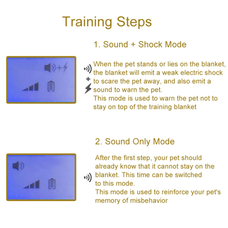 1. Sound + electric shock mode: when the pet stands on the training blanket, or lies on it, the training blanket will send out a weak electric shock to scare the pet away, and it will also send out sound to give the pet a warning; this mode is used to warn the pet that it can not stay on the training blanket