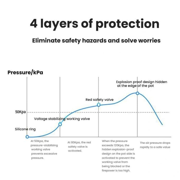 2. The pressure cooker operates at 50 kPa for rapid cooking, while its triple safety system—including a heat-resistant silicone sealing ring, precision pressure stabilizer valve, and visible red safety valve—ensures stable pressure control and prevents over-pressurization.