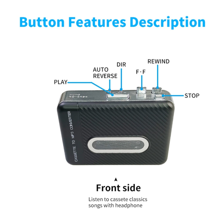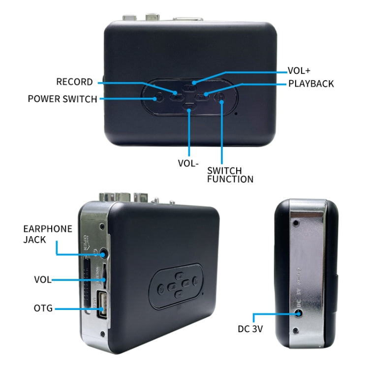1. Lid switcher: Slide down to open the lid, so can put cassette in.
