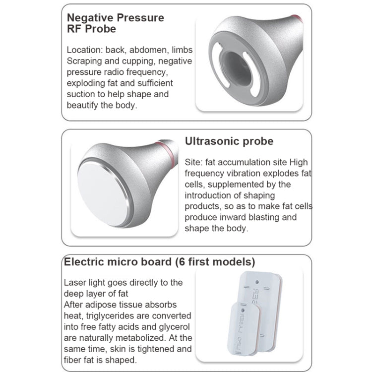 6. Principle: The ultrasonic cavitation generator is based on the resonance of pressure waves, carrying ultrasonic waves through the skin, directly penetrating the fat tissue and polymerizing it into small pieces, producing micro bubbles that melt the fat and turn it into liquid.