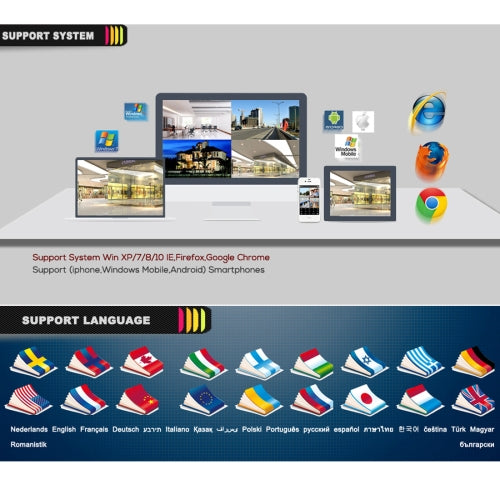 8. Network: Powerful network services (support DHCP, PPPOE, FTP, DNS, DDNS, EMAIL,IP searches etc.) And perfect support (WEB, Client, SDK), easy to achieve interoperability.