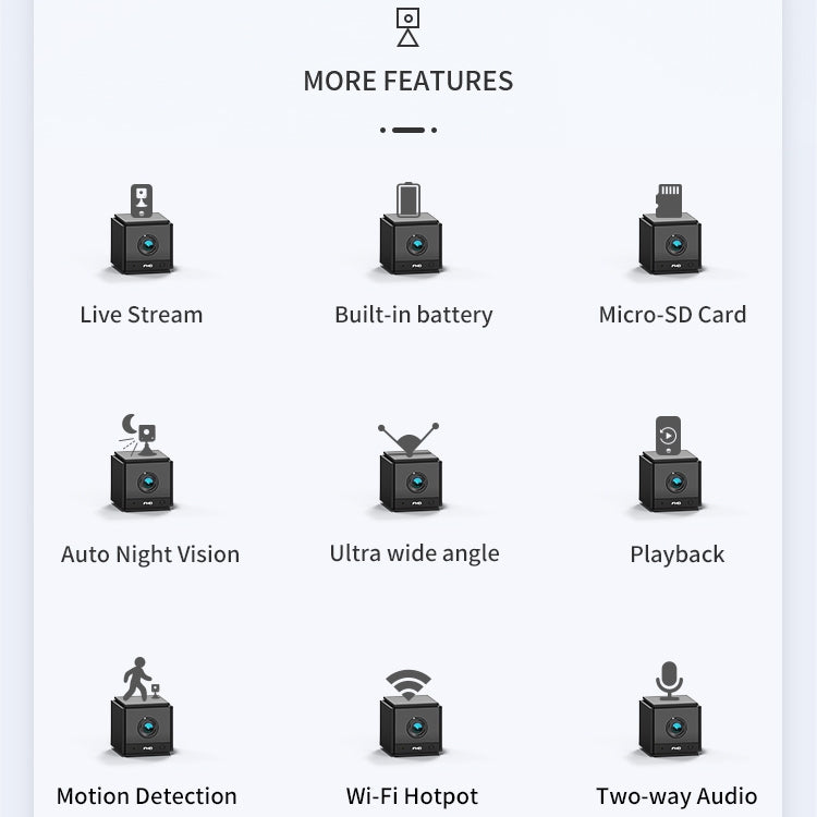 1. Mini Compact security camera, support two way audio, pet camera, baby monitor and siren alarm motion detection, which can be mount anywhere.