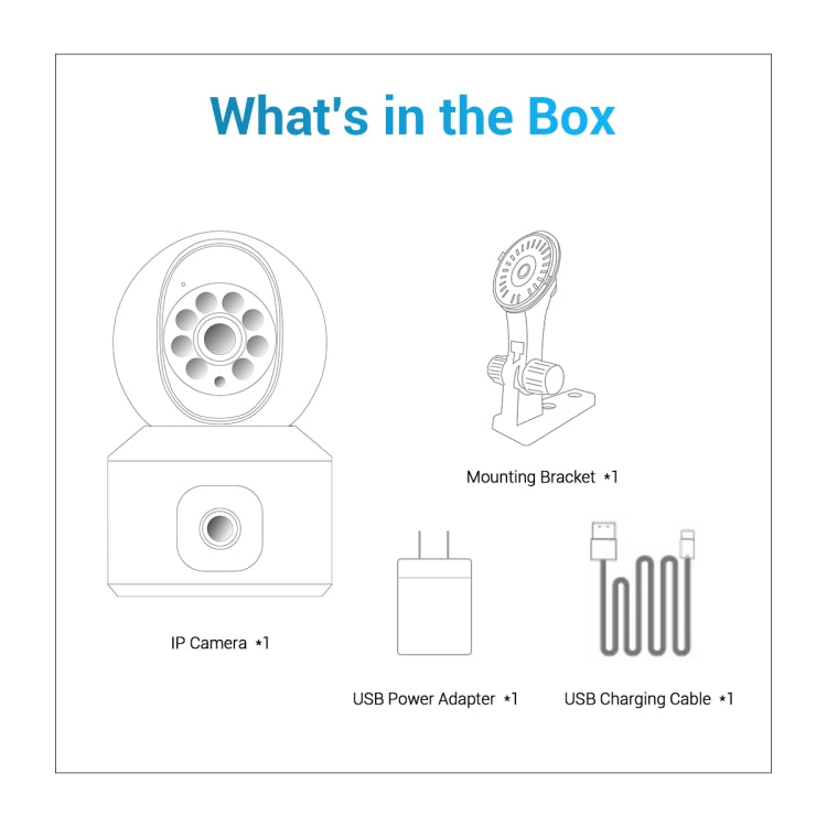 20. Accessories: 1x IP camera, 1x charger, 1x USB cable, 1x screw package, 1x stand