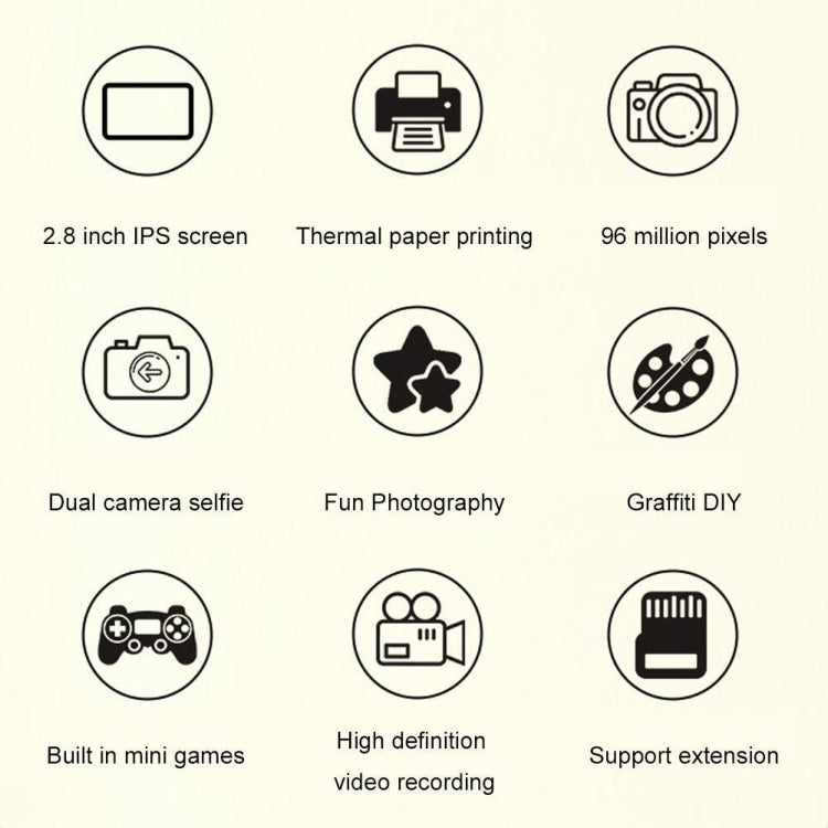 1. Functions: taking photos (Selfie, timing), printing, video recording, playback, games, photo stickers