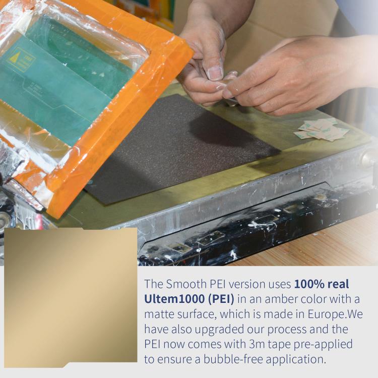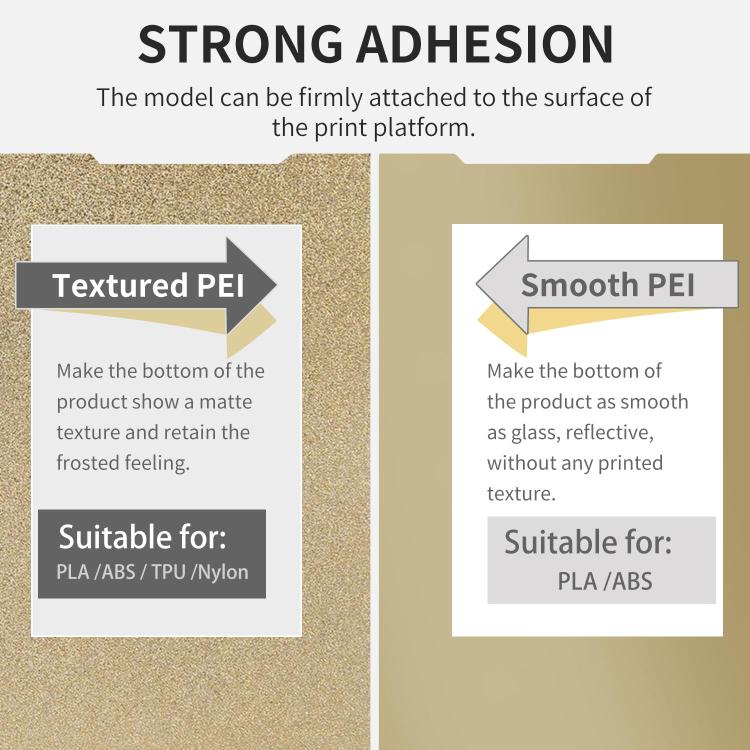4. Compatible Filaments: The film surface is smooth and easy to clean, and can be well adhered to various consumables. The PEI coating surface has a matte texture and can print materials such as PLA/ABS/PETG/TPU/nylon.
