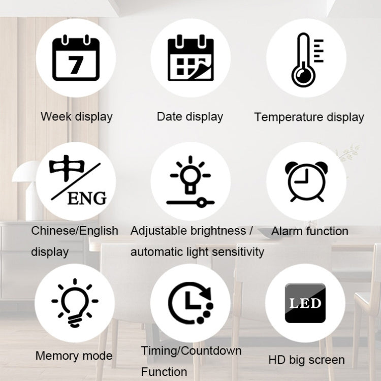 2. Functions: week display, date display, temperature display, Chinese/English display, adjustable brightness, automatic photosensitive, alarm function, memory mode, timing/countdown function, high-definition large screen