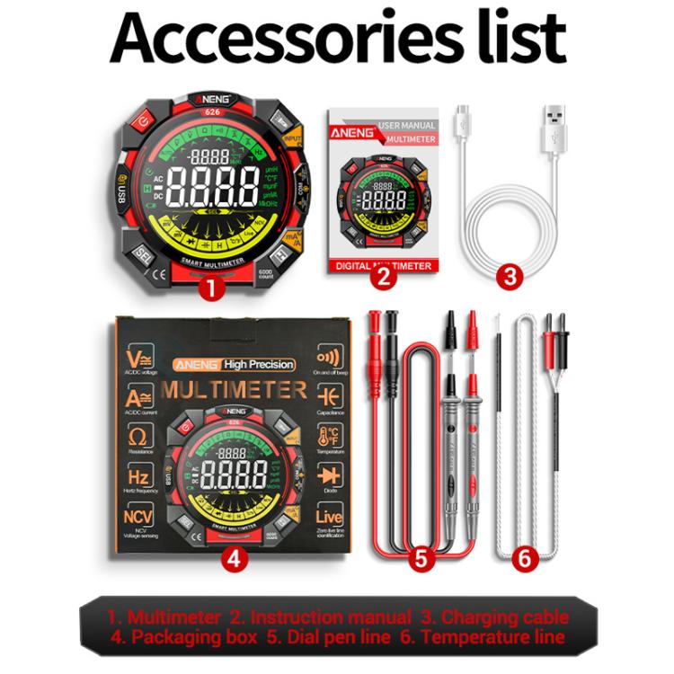 18. Packing list: multimeter; instruction manual; charging cable; test lead cable; temperature cable; packaging box