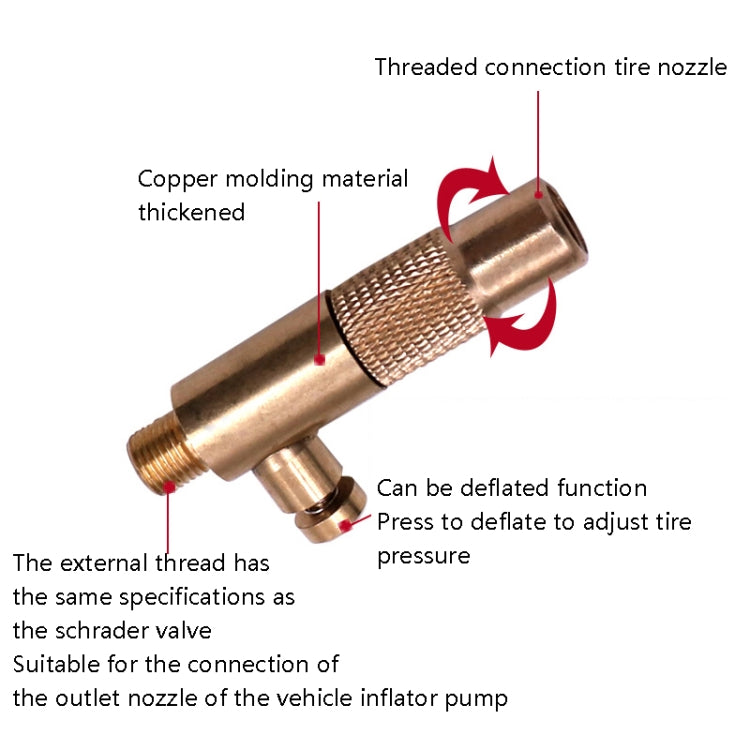 1. Copper material, screw-threaded to connect the tire mouth, airtight, easy to operate