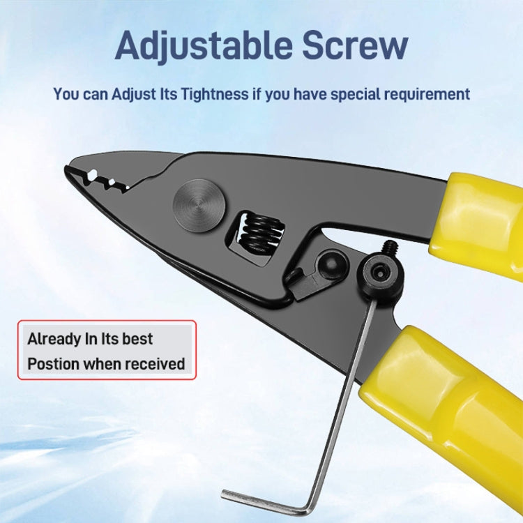 7. Cutting depth range of 3 ports: large hole is used to strip 2mm-3mm pigtail/jump wire outer protective layer, medium hole is used to strip 900 micron-250 micron pigtail/jump wire white soft rubber protective layer, small hole is used For stripping the coating layer of 250 micron-125 micron fiber core