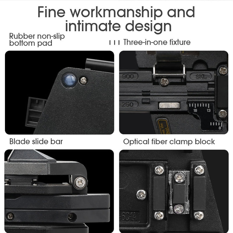 4. 3-in-1 fixture with 0.25mm bare fiber slot, 0.9mm pigtail slot, and 2.5-3.0mm leather cable slot