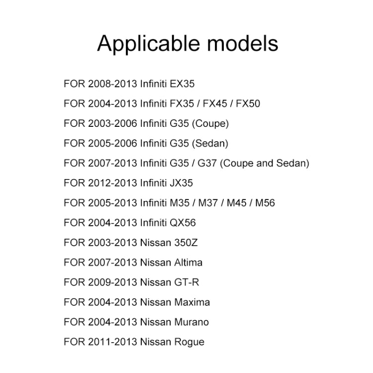10. Applicable models: suitable for Infiniti EX35 2008-2013, FX35 / FX45 / FX50 2004-2013, G35 (Coupe) 2003-2006, G35 (Sedan) 2005-2006, G35 / G37 (Coupe and Sedan) 2007-2013, JX35 2012-2013, M35 / M37 / M45 / M56 2005-2013, QX56 2004-2013, suitable for Nissan 350Z 2003-2013, Altima 2007-2013, GT-R 2009-2013, Maxima 2004-2013, Murano 2004-2013 , Rogue 2011-2013