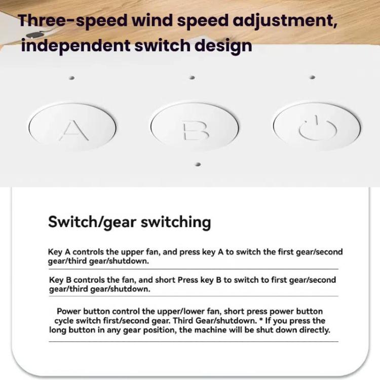 1. Dual-Heads with Independent Control & 3-Speed Settings: A and B buttons separately manage upper/lower fans (short press cycles through low/medium/high/off). Power button controls both fans simultaneously. Long press any button for instant shutdown. Customize airflow direction and intensity for personalized comfort.
