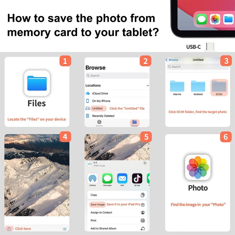 3. Plug and play:OTG card reader. No additional driver/software needed. No App required, plug and play,Portable and easily transfer photos,videos and files from your SD/TF card to a USB C device.With the card reader, share videos or pictures or others at any time. No need to use PC anymore, Fast and easy.