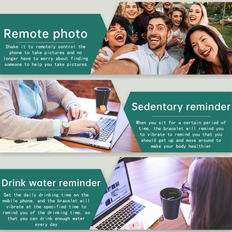 2. Multiple modes tracker to track your calories, pedometer, sedentary reminder, sleep monitoring, remote photo, message remind, alarm clock and other sports modes.