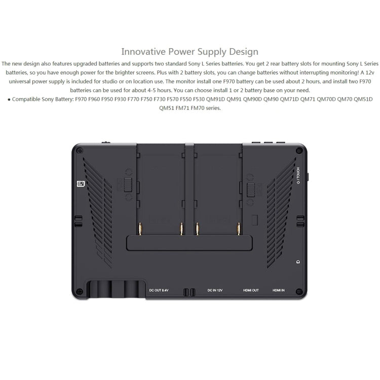 1. The 7-inch 1920x1200 Full HD panel displays images and videos with excellent color reproduction. The panel has an anti-glare coating, so you can comfortably monitor outdoors during the day. The important point is its brightness of 2200 nits, 1200:1 contrast ratio and sRGB/Rec.709 color gamut, which can provide excellent screen clarity even in bright light. The monitor display content reaches 323 pixels per inch (PPI), so you can rest assured to shoot in broad daylight and optimize the content on the spot. The 160-degree wide viewing angle of the display can also provide a clear picture view for multiple crew members at the same time