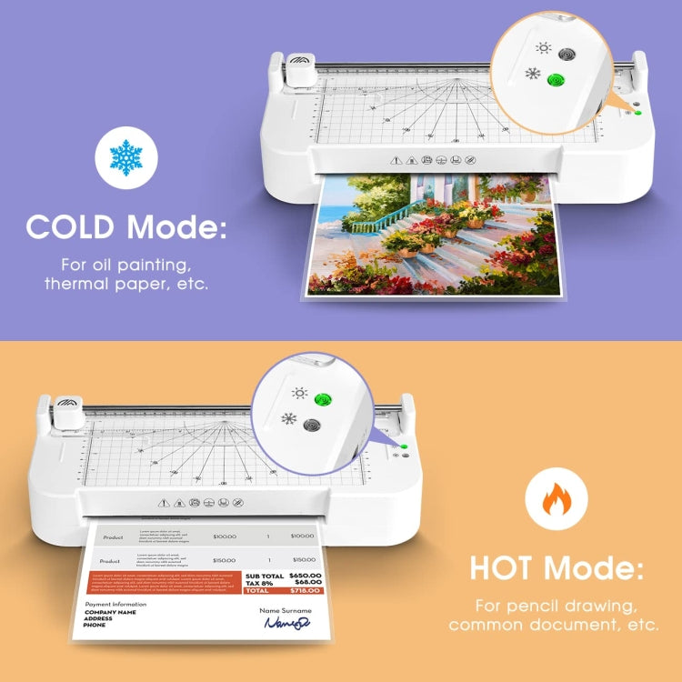2. Hot and Cool Modes: The cool mode is ideal for laminating hot inks and colors to keep colors from fading or melting. Hot mode is suitable for commonly used documents.