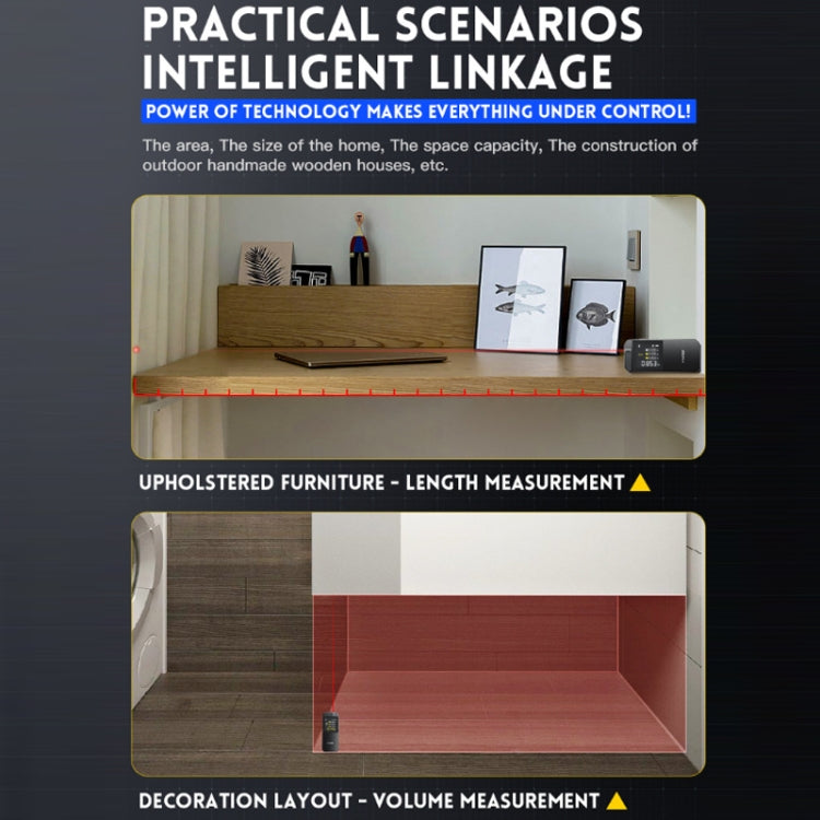 6. Covers a variety of measurement modes to easily meet the measurement needs of various scenarios: single measurement, multiple measurements, area measurement, volume measurement, primary Pythagorean, secondary Pythagorean, front and rear benchmarks, unit switching