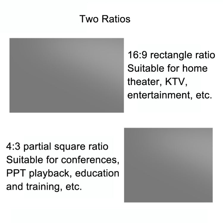 1. Two ratios, 16:9 rectangular ratio, suitable for home theater, KTV, entertainment, etc.; 4:3 partial square ratio, suitable for conferences, PPT playback, education and training, etc.