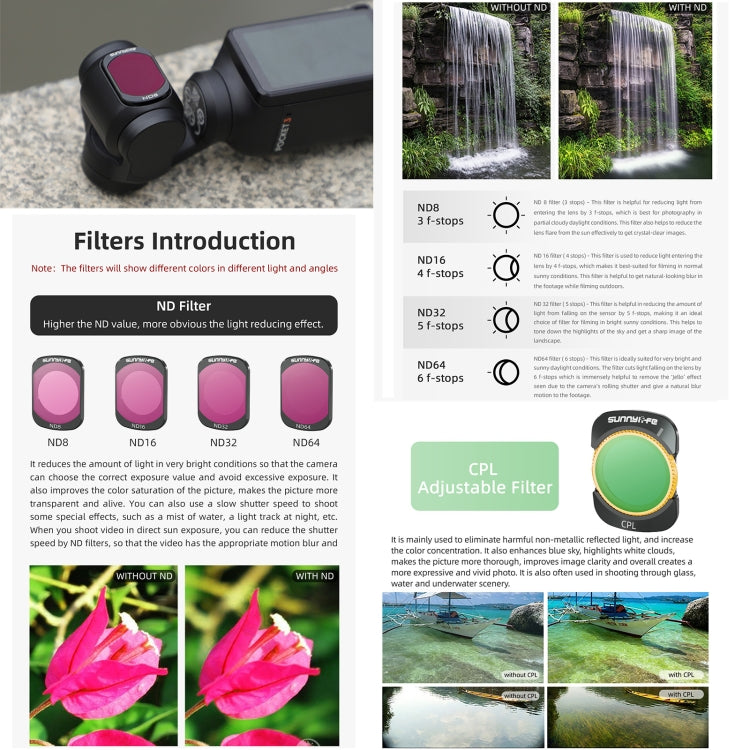 3. ND Filter: You can get more freedom to control aperture and shutter, bring more exposure methods and creative space for photography creation, and effectively prevent overexposure. The number behind ND represents the ability of the ND mirror to block light.
