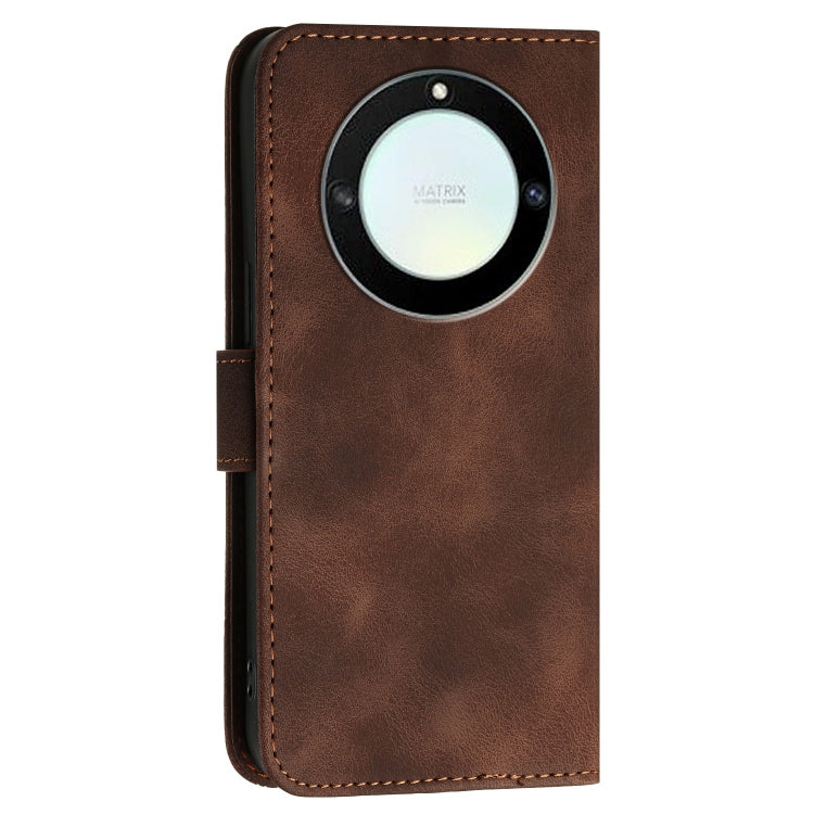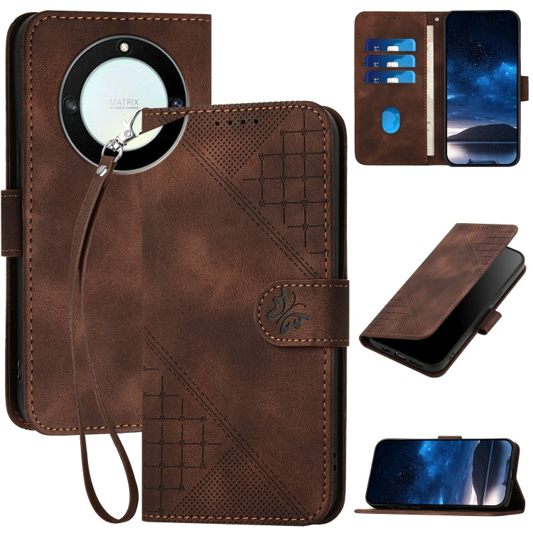 For Honor Magic5 Lite Grid Butterfly Embossed Pattern Leather Phone Case with Lanyard(Coffee)