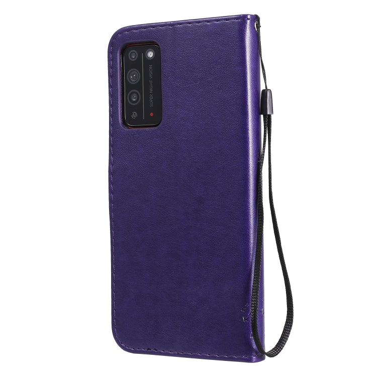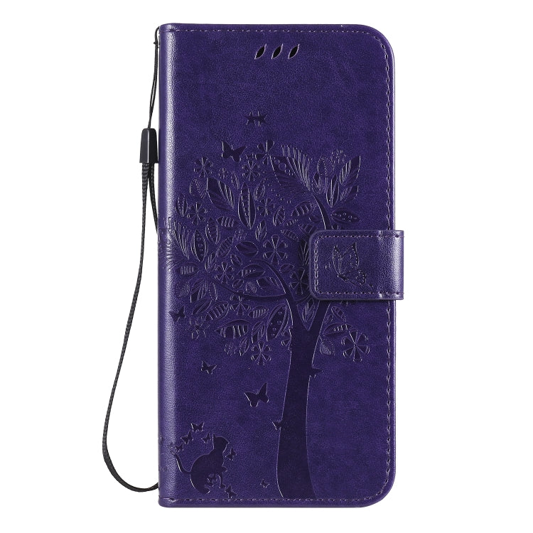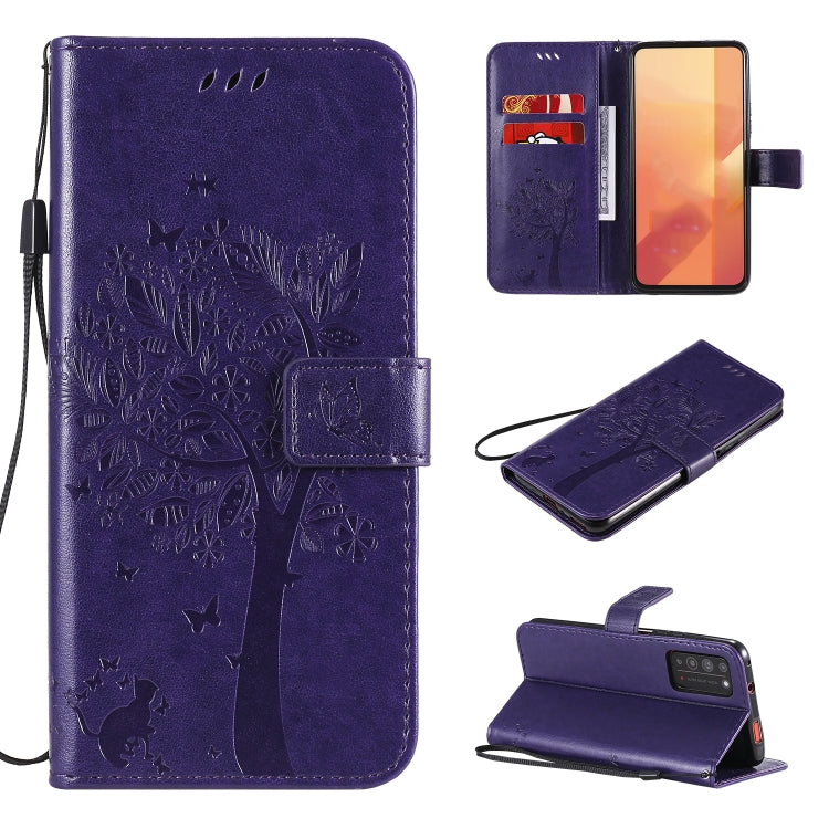 For Huawei Honor X10 5G Tree & Cat Embossed Pattern Horizontal Flip Leather Case with Holder & Card Slots & Wallet & Lanyard(Purple)
