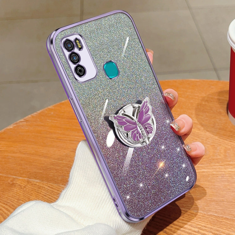For Infinix Hot 9 Play Plated Gradient Glitter Butterfly Holder TPU Phone Case(Purple)