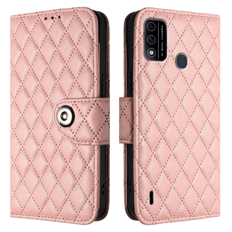 For itel A48 Rhombic Texture Flip Leather Phone Case with Lanyard(Coral Pink)