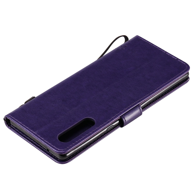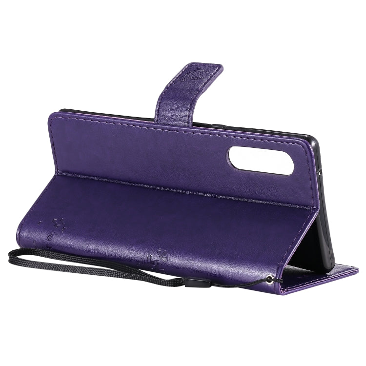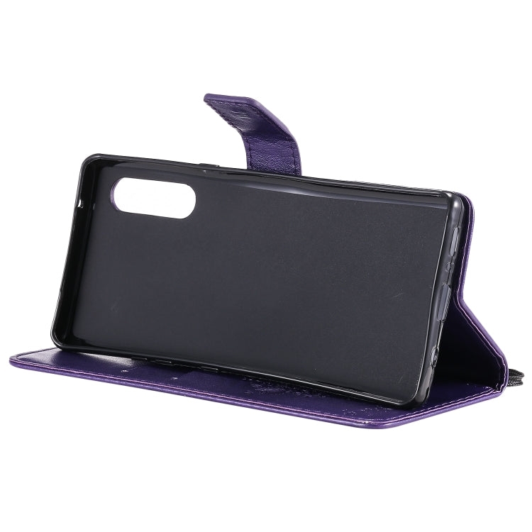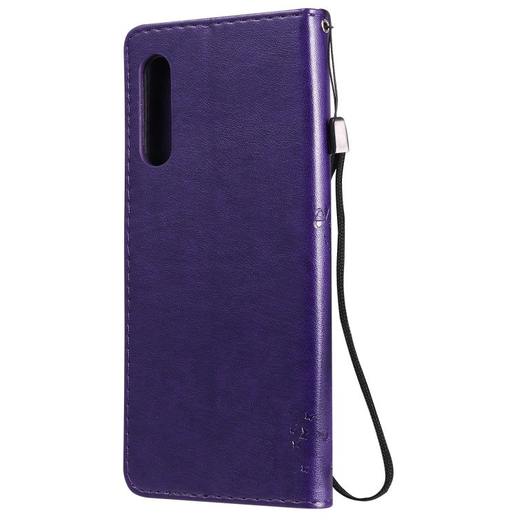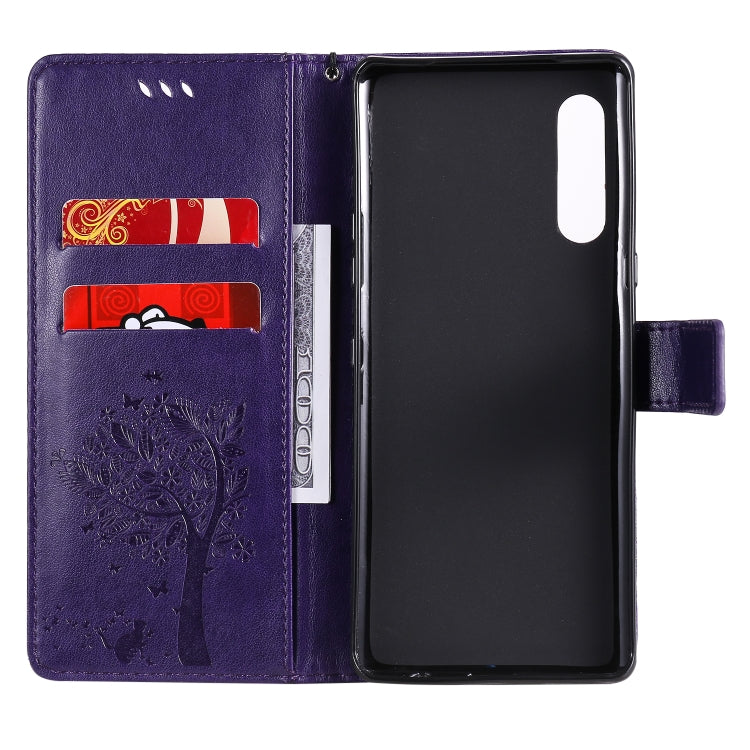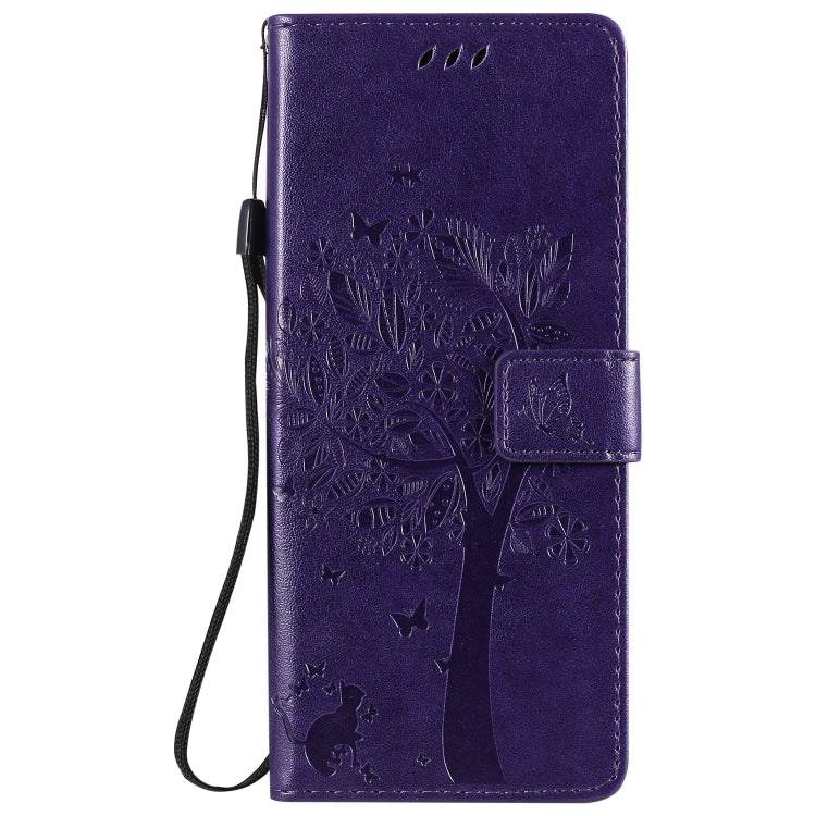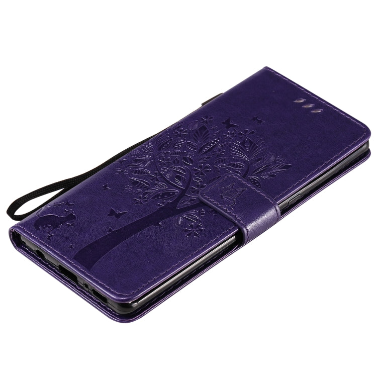 For LG G9 Tree & Cat Embossed Pattern Horizontal Flip Leather Case with Holder & Card Slots & Wallet & Lanyard(Purple)