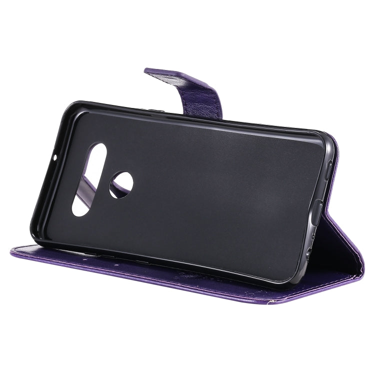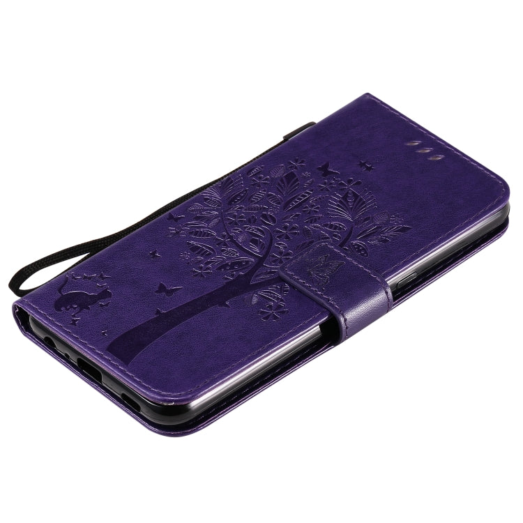 For LG K51 Tree & Cat Embossed Pattern Horizontal Flip Leather Case with Holder & Card Slots & Wallet & Lanyard(Purple)