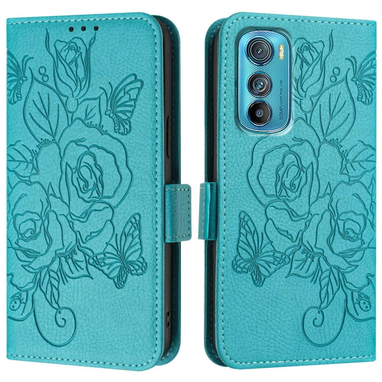 For Motorola Edge 30 Embossed Rose RFID Anti-theft Leather Phone Case(Light Blue)