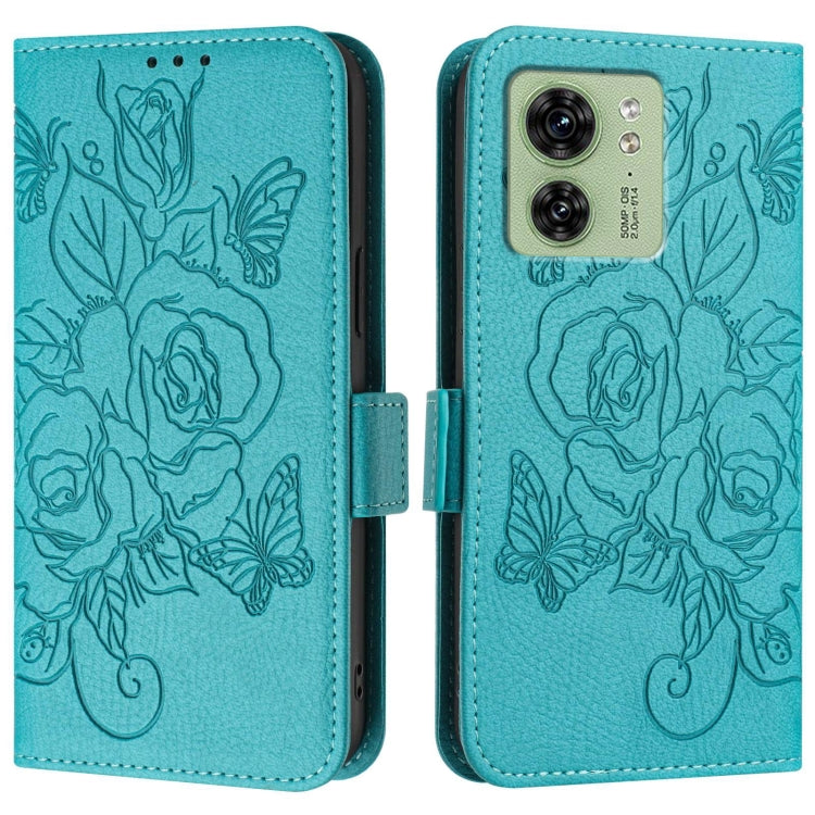 For Motorola Edge 40 5G Embossed Rose RFID Anti-theft Leather Phone Case(Light Blue)