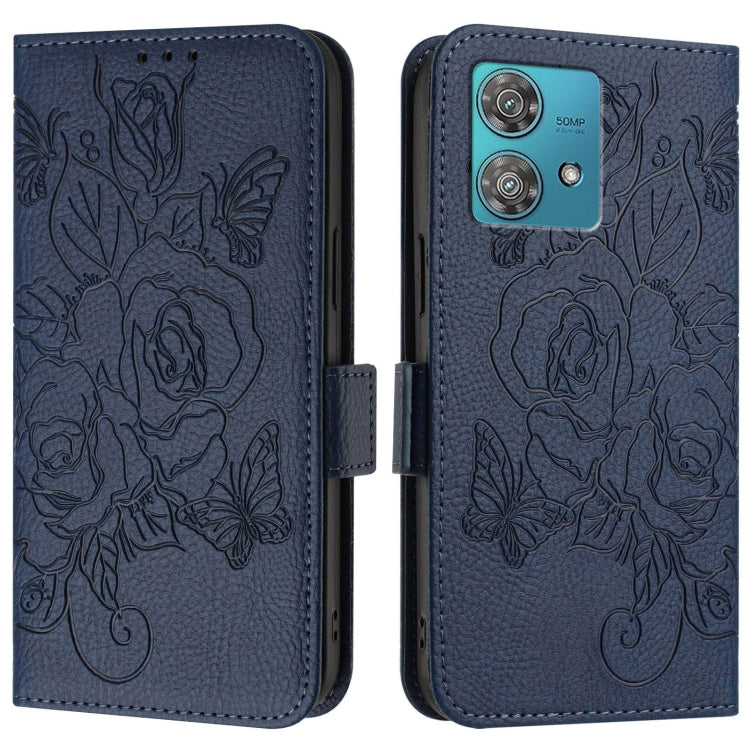 For Motorola Edge 40 Neo 5G Embossed Rose RFID Anti-theft Leather Phone Case(Dark Blue)