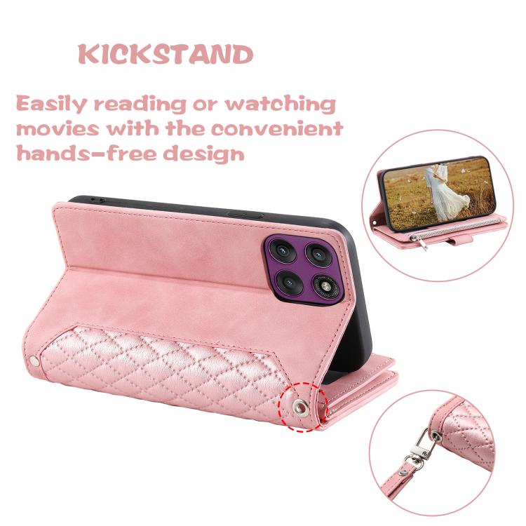 For Motorola Edge 60 Pro Grid Texture Zipper Leather Phone Case with Lanyard(Rose Gold)