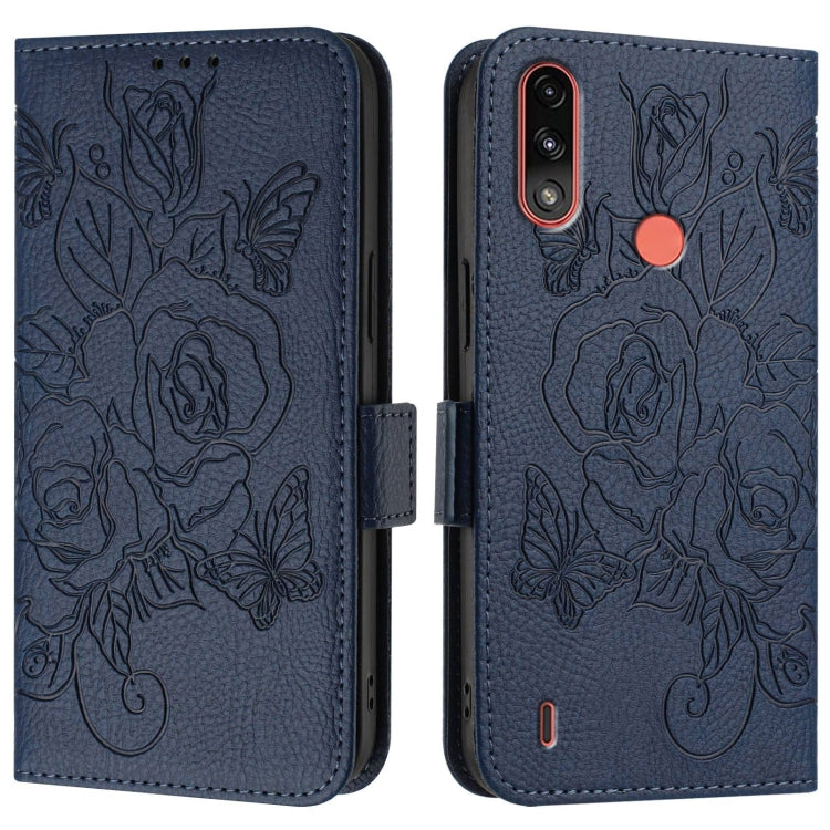 For Motorola Moto E7 Power 2021 Embossed Rose RFID Anti-theft Leather Phone Case(Dark Blue)