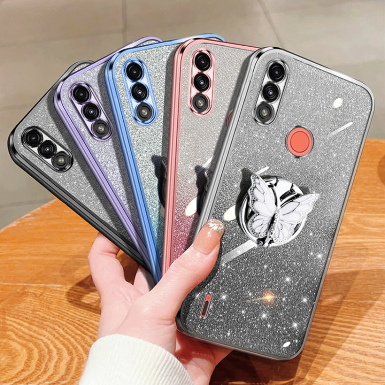 For Motorola Moto E7 Power Plated Gradient Glitter Butterfly Holder TPU Phone Case(Sierra Blue)