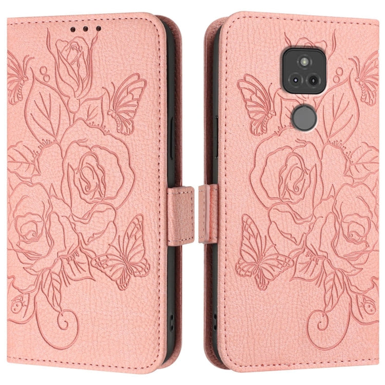 For Motorola Moto G Play 2021 Embossed Rose RFID Anti-theft Leather Phone Case(Pink)