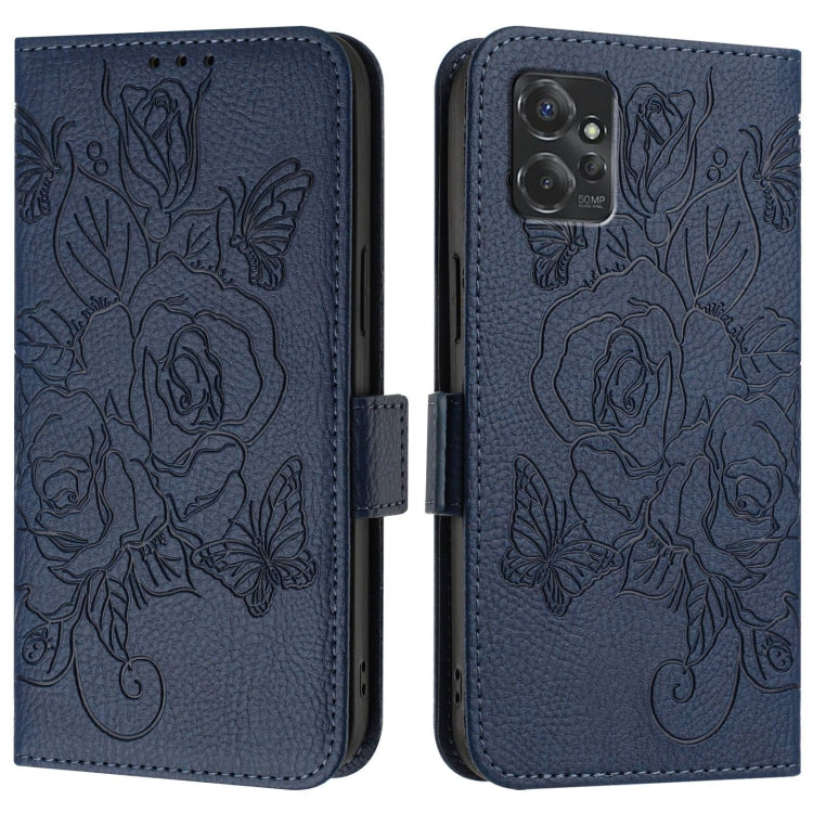 For Motorola Moto G Power 2023 Embossed Rose RFID Anti-theft Leather Phone Case(Dark Blue)