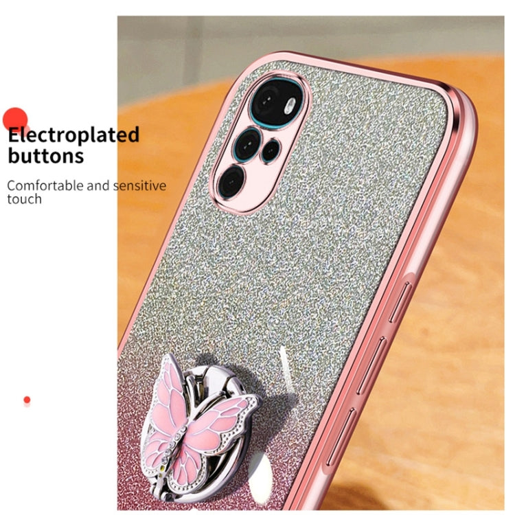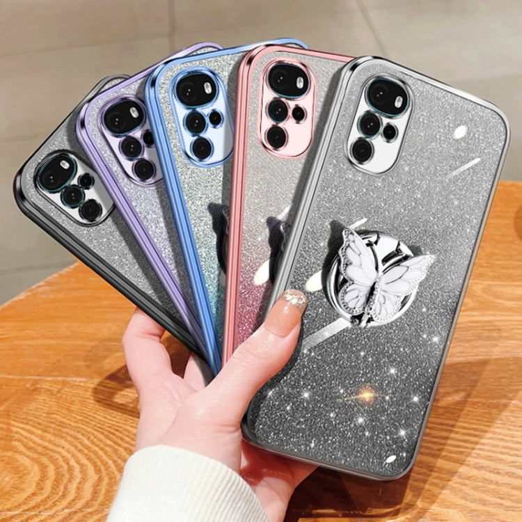 For Motorola Moto G22 Plated Gradient Glitter Butterfly Holder TPU Phone Case(Silver)