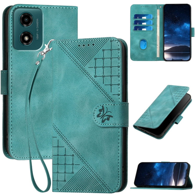 For Motorola Moto G24 4G Global Grid Butterfly Embossed Pattern Leather Phone Case with Lanyard(Light Blue)