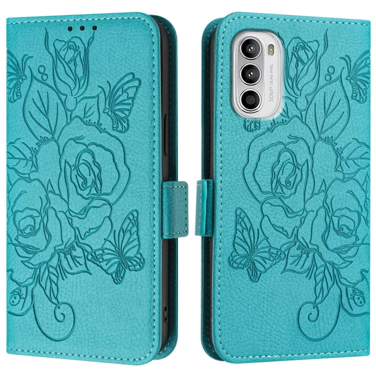 For Motorola Moto G52 4G / G82 5G / G71s 5G Embossed Rose RFID Anti-theft Leather Phone Case(Light Blue)