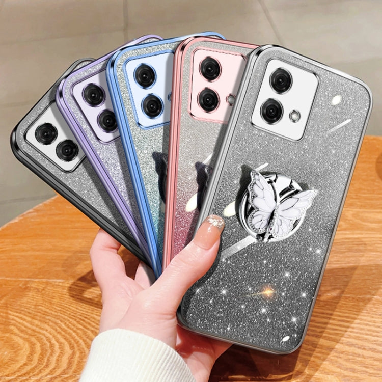 For Motorola Moto G84 Plated Gradient Glitter Butterfly Holder TPU Phone Case(Purple)