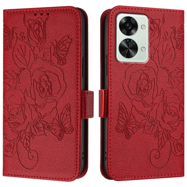 For OnePlus Nord 2T Embossed Rose RFID Anti-theft Leather Phone Case(Red)