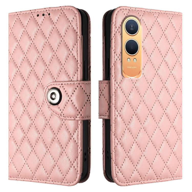 For OnePlus Nord CE4 Lite Rhombic Texture Flip Leather Phone Case with Lanyard(Coral Pink)