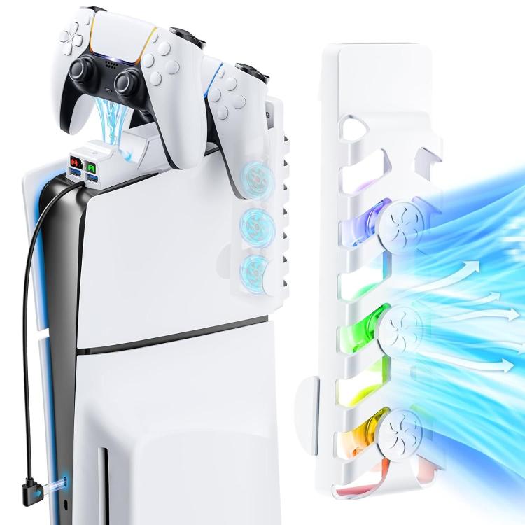 1. This product is directly fixed on the top surface of the PS5 Slim console (Digital Edition/Blu-ray Edition), integrating a three-speed cooling fan and dual controller charging function into a single device, enhancing the air flow through the top ventilation ports of the console.
