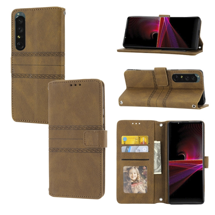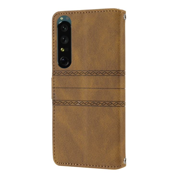 For Sony Xperia 1 IV Embossed Striped Magnetic Buckle Horizontal Flip Phone Leather Case(Brown)