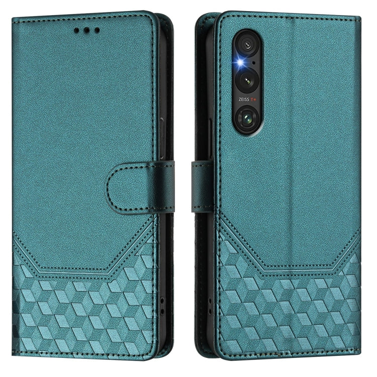 For Sony Xperia 1 V 2023 Honeycomb Embossing RFID Leather Phone Case(Peacock Green)
