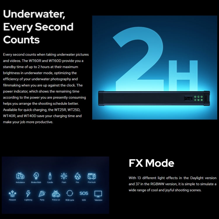 3. he 5600K CCT light automatically switches to higher power, outputting up to 415 lux at 3.3 ft. CRI/TLCI scores of 96 ensure color accuracy, and 13 preset special effects simulate a wide range of creative shooting scenes.