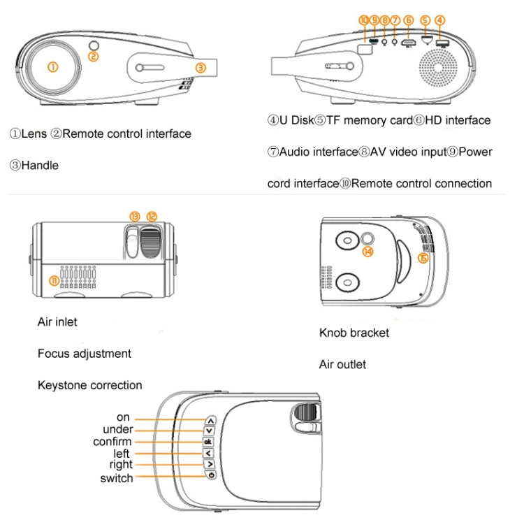 16. Interface: audio interface x1, HDMI interface x1, USB interface x1, power interface x1, TF memory interface x1, AV interface x1
