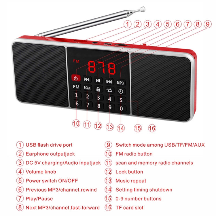 L-288AM Bluetooth Dual Speaker Radio MP3 Player Support TF Card/U Disk with LED Display(Red)