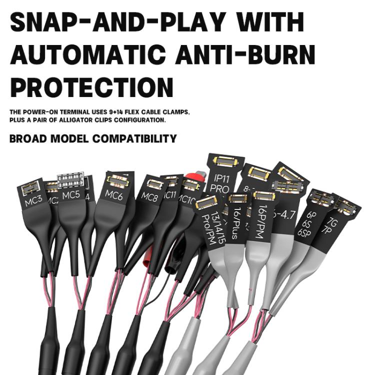5. Snap-and-play with automatic anti-burn protection on the power-on terminal, utilizing 9+14 flex cable clamps and a pair of alligator clips for configuration, broad model compatibility